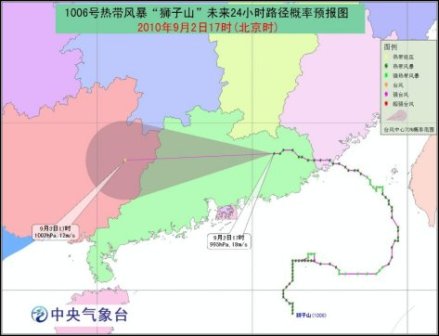 今年第6號熱帶風暴“獅子山”的中心于9月2日11時由福建省詔安縣移入廣東省饒平縣境內,17時“獅子山”位于廣東省興寧市境內,就是北緯24.1度、東經115.7度,中心附近最大風力有8級(18米/秒),中心最低氣壓為995百帕。