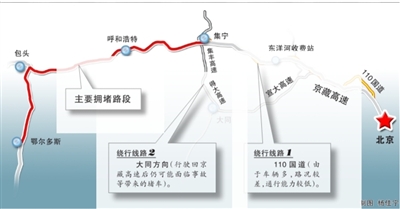 連日來,受大貨超載、車多、修路等因素影響,京藏高速重現大擁堵,上萬車輛滯留,內蒙古境內堵車路段更是長達120公里。與京外情況相比,110國道西關環島至延慶段的進京和出京方向交通都較為通暢,未現擁堵現象。