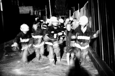 22時45分,所調集的東崗中隊一臺照明車正趕往現場。23時33分,特勤一中隊7名戰斗員到達現場。由于道路房屋都被泥水淹沒,給救援工作帶來了很大的困難。官兵們手抓大繩,走在齊腰深的淤泥中,一步一步到達現場后,發現多名群眾被困在房里面。時間就是生命!中隊長周暉立即命令一中隊官兵迅速展開救援,由于泥水淹至膝蓋,所有官兵只能緩慢的靠近被困群眾,然后一個個攙扶的進行轉移。