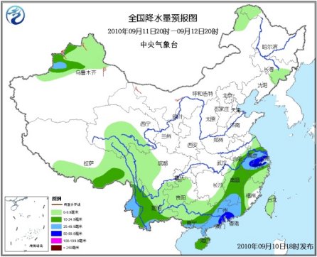 10日20時至11日20時,新疆西北部、青海南部、西藏中東部、內蒙古東南部、東北中南部、山東東部、江淮中東部、江南大部、華南、四川西部、重慶東南部、貴州、云南等地有小到中雨或陣雨,其中,江蘇東部和南部、上海、安徽東南部、浙江大部、江西東北部和東南部、福建西北部和南部、廣東大部、廣西南部、海南中北部、云南大部、川西高原南部、西藏東南部等地有大雨或暴雨,局地有大暴雨;上述地區局部并伴有短時雷雨大風或冰雹等強對流天氣。新疆北部、內蒙古東部、東北南部、華北東北部等地有4~5級風。黃海南部海域有5~6級西南風增大到7~8級的旋轉風,陣風可達9~10級;東海西部海域、臺灣海峽有7~8級偏南風,陣風可達9~10級;南海東北部海域、臺灣以東洋面和以南海域有5~7級西南風;黃海中部海域將有5~6級東北風。