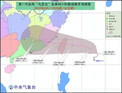 預計,“凡亞比”中心將以每小時10公里左右的速度向西偏北方向移動,逐漸向中國臺灣東部一帶沿海靠近,強度繼續加強,將于19日白天在這一帶沿海登陸。