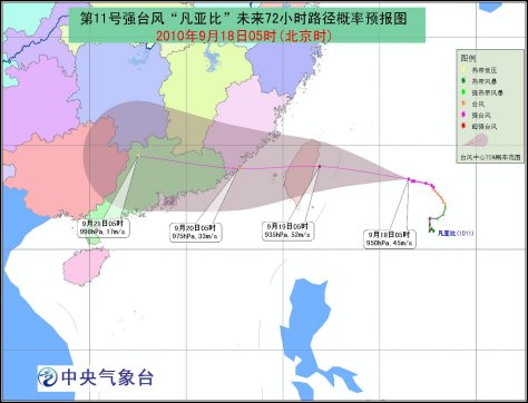 18日5時,今年第11號強臺風“凡亞比”的中心位于臺灣花蓮市東偏南方大約500公里的西北太平洋洋面上,就是北緯23.4度、東經126.5度,中心附近最大風力有14級(45米/秒),中心最低氣壓為950百帕。