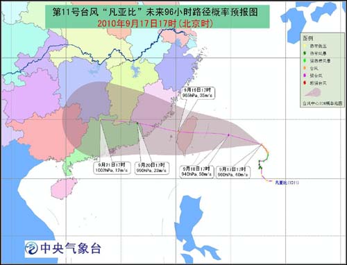 據中央氣象臺預計,受“凡亞比”影響,中國東南海區將有狂風。17日至21日,受其影響,臺灣以東洋面、東海南部、巴士海峽、巴林塘海峽、臺灣海峽、臺灣省及其沿海、福建東部及沿海、浙江東南部沿海、廣東東部沿海的風力將逐漸加大到7~9級,部分海域或地區的風力可達10~12級,“凡比亞”中心經過的附近海面或地區的風力有13~16級。