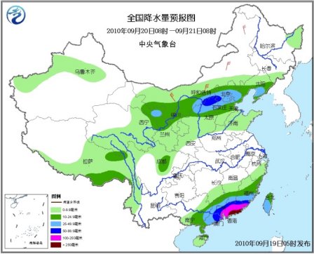 20日08時至21日08時,新疆沿天山地區、西藏南部和東部、西北地區中東部、內蒙古西部和中東部偏南地區、東北地區南部和東北部、華北、黃淮東北部、四川中北部、云南西部、江南南部、華南大部有小到中雨或陣雨,其中,甘肅河西地區東部、內蒙古河套東部、陜西北部、山西北部、北京、天津北部、河北中北部、遼寧中南部等地的部分地區有大雨、局地暴雨;福建南部、臺灣中南部、廣東、江西南部、廣西東部等地有大到暴雨;福建東南部、廣東中東部等地的部分地區有大暴雨、局部特大暴雨;上述地區局部并伴有短時雷雨大風或冰雹等強對流天氣。新疆北部、甘肅西部、寧夏、內蒙古大部、華北北部和東部有4~6級風,新疆山口地區風力可達7~9級。受“凡亞比”影響,東海南部有6~8級東南風;臺灣海峽、南海北部有7~9級大風,部分海域風力可達10~11級,臺風中心經過的附近海域有12~13級大風;臺灣以南海域有6~7級、陣風8級的偏南風。渤海有4~5級增加到6~7級的東北風。