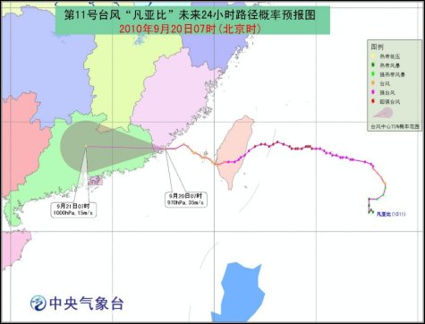 中央氣象臺預計,“凡亞比”將以每小時20公里左右的速度向繼續偏西方向移動,強度逐漸減弱。