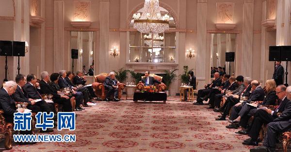 當地時間9月22日上午,在紐約華爾道夫飯店一間寬敞的會議室里,溫家寶總理望著坐在身旁的基辛格,以40多年來中美關系的發展入題,與美國企業、金融和學術界一些著名人士展開座談和交流。