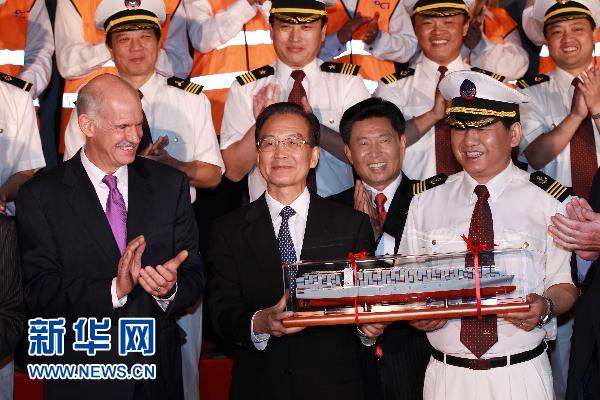 隨后,中希兩國總理又來到停靠在碼頭邊上的“中遠太倉”號集裝箱貨輪旁。這艘可裝載10000個標準箱的集裝箱貨輪,由中遠集團旗下的南通中遠川崎公司自主設計建造。溫家寶和帕潘德里歐走到船邊,看望了船員和碼頭工人,并與他們在輪船旁合影。船長向兩國總理贈送了“中遠太倉”輪的船模。