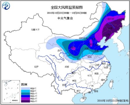 根據這份寒潮藍色預警,預計,10月23日08時至25日08時,內蒙古大部、東北、甘肅大部、西北地區東部、華北、黃淮、江淮北部等地將出現6~12℃降溫,其中,寧夏中部、河北西部和東北部、內蒙古東南部、東北大部等地的部分地區降溫幅度可達14~16℃;上述大部地區有4~6級偏北風。