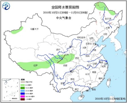 10月31日08時至11月1日08時,新疆南疆盆地西北部、內蒙古東北部、黑龍江西北部、西藏南部、青海東南部、甘肅南部、川西高原北部等地有小雨(雪)或雨夾雪;陜西西南部、四川北部等地的部分地區有小雨或陣雨。內蒙古東部、東北地區等地有4~6級風。臺灣海峽、臺灣以東洋面和以南海域、南海東北部、中部和西南部海域將有7~8級、陣風9級的東北風;東海東北部和南部海域、南海西北部海域將有6~7級、陣風8級的東北風。