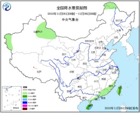 中央氣象臺預計,今天白天到夜間,新疆東部和西南部、內蒙古東北部局部、黑龍江西北部等地有小雨(雪)或雨夾雪;福建東部和南部、廣東南部和東部、海南、臺灣等地有小到中雨或陣雨,其中,海南東南部的局地有大雨;新疆東部、甘肅西部、內蒙古大部、東北中北部等地有4~6級風。