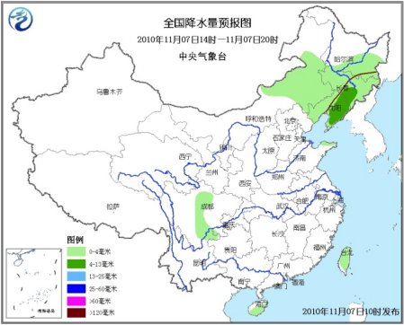 今天14時(shí)至20時(shí),內(nèi)蒙古中東部有小到中雪;黑龍江南部、吉林西部、遼寧西部等地有雨夾雪;遼寧東部、吉林東部、山東半島北部、川西高原東部、云南東北部、海南南部、臺(tái)灣大部有小到中雨或陣雨。