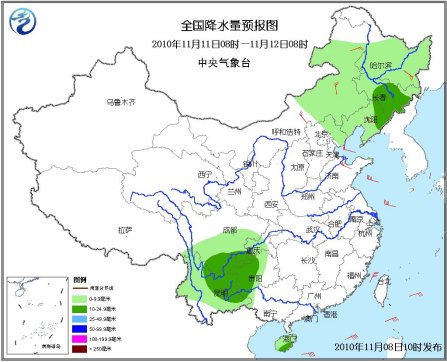 11日08時(shí)至12日08時(shí),內(nèi)蒙古東部、東北地區(qū)有小到中雪,其中東北地區(qū)南部的部分地區(qū)有大到暴雪;西南地區(qū)東部有小到中雨;華北、東北等地有4-5級風(fēng)。