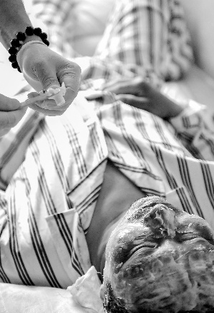5日,從事故中脫險的44歲漢子夏維剛躺在市中心醫院334號病房內,灼傷的臉上涂滿藥膏。大火發生時夏維剛在安全地帶,返回火場救人時才被燙傷,他們抬出的工友有30多個。