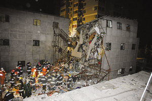 據樊女士介紹,事情發生在晚上9時10分許,她當時聽見轟然一聲巨響,隨后發現工棚西半邊全塌了。她跑到陽臺上去看時,發現陸續有七八名工人從廢墟中爬出來,渾身白灰癱坐在院子里。這時有工人用手機打電話報警,但地方口音很重,加之一著急,說話非常快,大部分都聽不懂,她只聽出來工人說有二三十人被埋。由于工人無法告知警方準確的出事位置,她趕緊拿起電話幫忙報警。