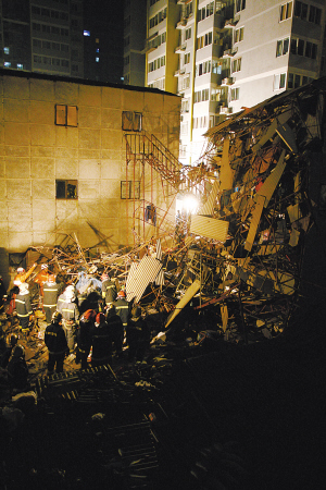 本報訊 昨晚9時10分許,宣武區北緯路附近的暢柳園小區西南角一3層工棚發生坍塌,20余名工人被埋。截至今日零時,26人被送醫院,其中兩人死亡。1時左右,有吊車進入,準備將發生坍塌工棚的東側部分拆除。