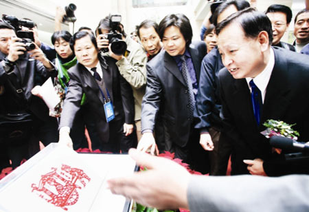 昨日上午11時,《國風歸來——第二屆全國剪紙藝術展》在省藝術館開幕,胡錦濤總書記剪紙作品《回娘家》正式與觀眾見面。省委書記、省長羅清泉,省委常委、宣傳部部長張昌爾,副省長李春明,省政協副主席王少階,省政府秘書長段輪一等出席了開幕式,來自全國各地的上千名觀眾如潮水般涌入藝術館參觀。
