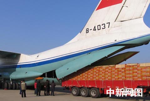 據介紹,此次運送的救災物資是由石家莊藁城市燃亮蠟燭廠加班生產的,共計約120噸,是由商務部緊急組織、河北省商務廳協助辦理的,石家莊機場負責物資裝卸及相關保障工作。承擔運送物資的三架伊爾—76運輸機,一架為中國聯航,另兩架為中國空軍所屬。