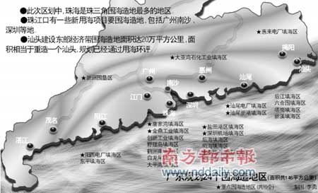 李珠江透露,圍海造地的地區珠三角是珠海最多,汕頭也比較多。此外,“珠江口有一些新用海項目要圍海造地,包括廣州南沙、深圳,數量可能不小。粵東的汕頭建設東部經濟帶圍海造地面積達20萬平方公里。汕頭圍海造地的規劃已經通過用海環評,面積相當于重造一個汕頭。但廣州的南沙不可能圍太多,因為要泄洪。”