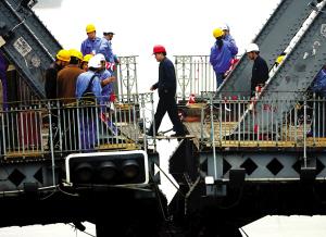 為保證外白渡橋移橋過程中橋梁結構安全,移橋工作將分南、北兩跨分次進行。今天上午先移除南跨橋體,明后天移除北跨橋體。昨天下午,負責“移橋”的千噸駁船已進入金山路閘橋,停靠外白渡橋上游。今天上午9時10分,兩艘拖船將駁船拖至外白渡橋南跨橋體正下方,截至上午10時,駁船已開始頂升橋體。