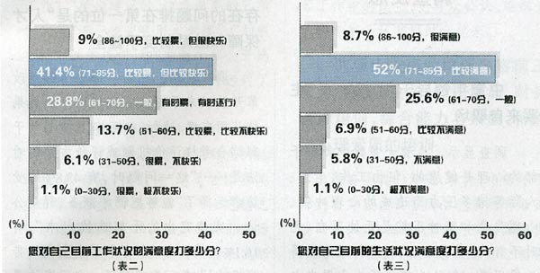 調查顯示,盡管大多數中青年干部的心理是健康的,但由工作、生活、人際等諸多壓力而造成的心理沖突、心理失衡和精神壓抑是無處不在、無時不有的。受訪者在回答“如果您覺得活得很累,您認為您的壓力主要來自哪些方面?”這一問題時,選擇最多的前三項分別是“工作責任心太強,追求完美之累”,“工作負荷重,疲于奔命之累”,“迎合領導出政績,失去自我之累”,選擇比例分別達到了51.3%,34.7%和29.2%,而選擇“交際太繁,苦于應酬之累”,“前程靠人恩賜,職場非正常競爭之累”的各占20.3%,并列排在第四位,最后依次是“家庭負擔重,子女入學就業之累”,占12.9%,“與同事、朋友比心理不平衡之累”,占5.9%,以及“多種壓力”等,占2.6%。
