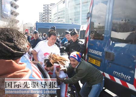 本報記者親眼看到,一個“藏獨”分子突然跳進安全防護欄,旁邊的法國警察眼疾手快,迅速把他按倒在地,然后扔出了安全防護欄。即使遇到一些政客出來挑事,警察也同樣不會客氣。據英國《衛報》記者記述,一個巴黎市綠黨議員在火炬接力開始時突然表示抗議,很快被警察請了出去。