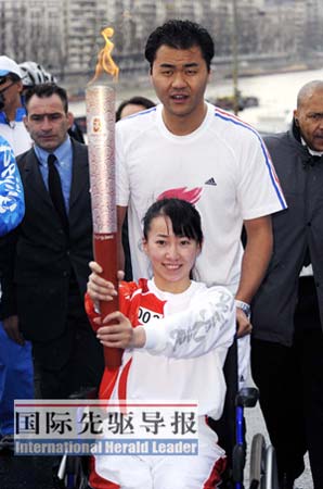 4月7日中午時分,作為巴黎段第三棒火炬手的她,正在等待第二棒火炬手到來時,“藏獨”分子突然上來搶她手中的火炬。