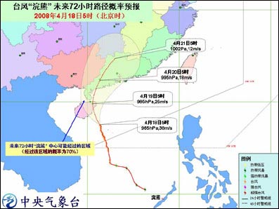 中新網(wǎng)4月18日電 據(jù)問(wèn)天網(wǎng)消息,中央氣象臺(tái)今天早晨六點(diǎn)鐘發(fā)布臺(tái)風(fēng)橙色緊急警報(bào):今年第1號(hào)臺(tái)風(fēng)浣熊(NEOGURI)的中心今天早晨5點(diǎn)鐘位于海南省萬(wàn)寧市東南偏南方向大約180公里的南海中部海面上,就是北緯17.5度,東經(jīng)111.4 度,中心附近最大風(fēng)力有13級(jí)(38米/秒)。