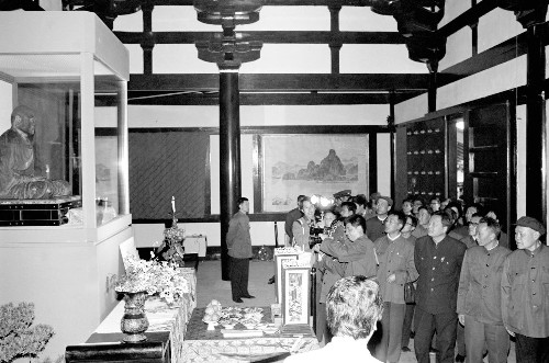 建于公元1688年的御影堂內,供奉著鑒真乾漆夾造的坐像,高2尺7寸,面向西方,雙手拱合,結跏跌坐,團目含笑,兩唇緊斂,表現(xiàn)鑒真于公元763年圓寂時的姿態(tài),已被定為日本國寶,每年只開放3天供人瞻仰。日本著名畫家東山魁夷為御影堂繪制的68幅屏障壁畫,有《云影》、《濤聲》、《黃山曉云》、《揚州薰風》、《桂林月宵》和《瑞光》等。