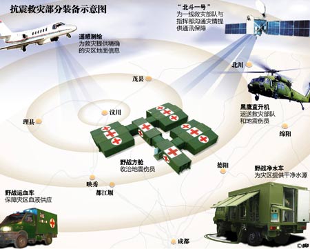 “北斗一號”、航測飛機、野戰醫療方艙、野戰運血車……這些帶有硝煙味道的軍事名詞,在連日來的四川抗震救災中大顯身手,發揮了不可替代的作用。