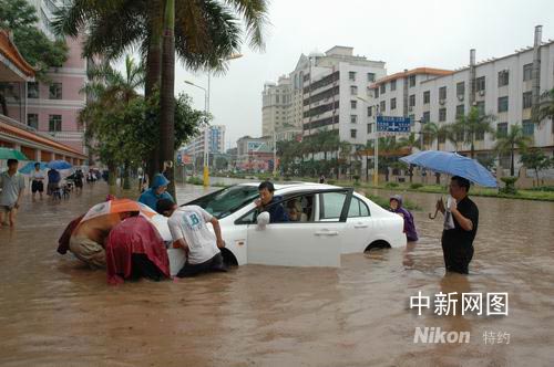 受高空槽和切變線共同影響,六月五日至六日,廣東茂名各地出現(xiàn)明顯強降水過程,全市日降雨量均值八十五毫米。由于降雨量大且強,致使茂名市局部地區(qū)出現(xiàn)洪澇和山體滑坡災害,并導致高州古丁鎮(zhèn)一名九歲男學生及一名十四歲女學生失蹤。據(jù)統(tǒng)計,這次暴雨成災,茂名全市有六個縣區(qū)八十一個鎮(zhèn)約六十萬人受災,倒塌房屋近千間,直接經(jīng)濟總損失二億元人民幣。圖為茂名市區(qū)幾成澤國。 中新社發(fā) 梁盛 攝