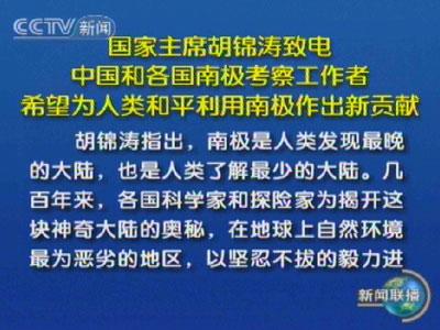 中新網(wǎng)6月21日電 據(jù)中央電視臺(tái)新聞聯(lián)播消息,6月21日是南半球的“冬至”,也是南極洲的重要傳統(tǒng)節(jié)日仲冬節(jié)。今天,中國(guó)國(guó)家主席胡錦濤發(fā)出慰問(wèn)電,代表中國(guó)政府和中國(guó)人民,并以他個(gè)人名義,向在南極漫長(zhǎng)極夜中勤奮工作、頑強(qiáng)拼搏的中國(guó)南極長(zhǎng)城站、中山站的全體考察隊(duì)員,向奮斗在南極地區(qū)的各國(guó)科學(xué)家和工程技術(shù)人員致以誠(chéng)摯的問(wèn)候,祝他們仲冬節(jié)快樂(lè)。