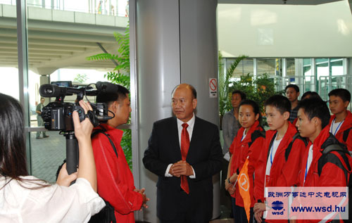 到機場迎接青少年代表團的有中國駐匈牙利大使張春祥先生、政務參贊梁才德先生、政治處主任劉波先生、辦公室主任薛山先生等。匈牙利外交部亞太司副司長古蒂先生、外交部國際合作司參贊福多爾女士及接待單位匈外交部下屬的國際發展局執行局長巴拉尼女士等。