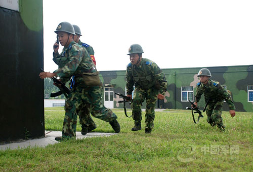 “接到上級通報,一名恐怖分子侵入我導彈庫區(qū),欲實施破壞。上級命令我部快速將其抓捕”。警衛(wèi)連應急分隊隊長余立華下達作戰(zhàn)任務后,火速帶領隊員奔向目標地域。8月8日,一場反恐演練在濟空某部展開。
