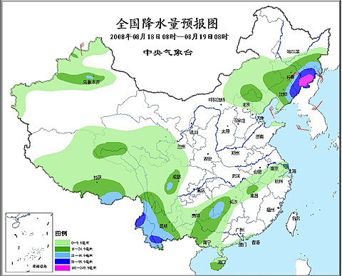 2008年8月18日08時—8月19日08時 全國降水量預(yù)報圖