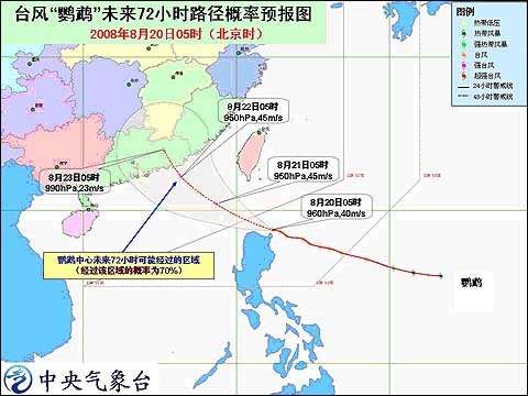 命令稱(chēng),“鸚鵡”(Nuri)的中心今天8時(shí)位于臺(tái)灣恒春市東南偏南方向約370公里的海面上,即北緯18.7度,東經(jīng)122.0度,中心附近最大風(fēng)力有13級(jí)(40米/秒)。預(yù)計(jì),臺(tái)風(fēng)中心將以每小時(shí)15至20公里的速度繼續(xù)向西偏北方向移動(dòng),強(qiáng)度還將有所加強(qiáng),將于今天夜間進(jìn)入南海東北部海面,然后逐漸向廣東中部到福建南部一帶沿海靠近。