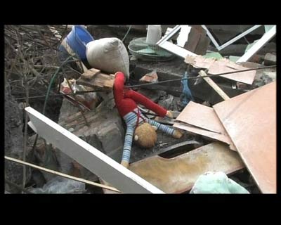 馮小寧:我下來的時候就不是為了拍一個電影而下來,現在到了北川以后,我有這么多天以后,我有更強烈的一個感受,我不拍,我不會拍,我可以寫,我手中有第一手的資料,我也有拍攝這種災難大片的超常的本事,我無法去用電影的真實再營造那種災難,摧毀我們那么多生命的這種過程,這是我從良心深處不愿意做的事情。因為我可以營造一切故事、氣氛,這么多真實的東西都是最感人的素材,但是有一點我做不到,就是我無法去營造地震的瞬間,那么多活生生的生命,那種慘狀,我不能再現它,我受不了。我設想我們做電影的可以重現那些東西,孩子們從教室中向外奔跑,最后塌下來,把他們壓倒,做不到。而且我在災民之中,我深知如果這些電影再讓他們看見的時候,是對他們多么強大的一種人性上的摧殘,對所有活著的那些上百萬的四川災民。就在給我開車的那個司機朋友,實際上他也是個干部,他就說到,他的夫人,其實大家在電視中就知道,就是剛出生三個月的嬰兒,他愛人都一起被砸在里邊,然后他說太感動了,母愛的偉大,自己在里頭三四天,才被救出來,自己都生命都不保,但是還喂嬰兒,喂她的孩子,我覺得他們才真讓我們覺得驚訝,就是一個普通的朋友,為我們開車,他的故事就可以說驚動全世界。他們有句話,說我們北川幾萬個家庭,每一個家庭都是驚心動魄的故事。坐在車后頭坐的一個工程師,他一家人都沒了,就剩他孤身一個,因為什么?正好他那天出差,到旁邊的一個縣去出差,回來以后都沒了。第二天我們去北川的廢墟那兒拍攝的時候,他們就去,他說他的兒子開出租,那天正好在停車場那兒,出租車都停在那兒,地震發生以后,這些人就失蹤了,因為被一座山給埋了,整個山上的巨石,十米直徑的那種大巨石成群地滾下來,沒了。所以他走到那兒的時候他就說你看,我兒子就在這里頭,正好他們在那兒翻,翻到一個被砸碎的,車都砸得亂七八糟的,碎末,他從一個碎石縫里頭翻出,我看前保險杠,我拍下來了,他撿起了一個車牌,他說正好這個車牌就是我兒子的,后來大家就往前走,我就說了一句,我說你還是把它收起來吧,這是你孩子唯一的東西,因為家都沒了,孩子唯一的一個紀念物,他就把它收起來,拿一個塑料袋兜起來。
