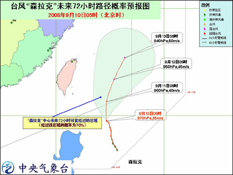 今年第13號臺風“森拉克”(SINLAKU)今天5時位于中國臺灣省恒春市東南方向大約490公里的洋面上,也就是北緯19.5度,東經124.7度,中心附近最大風力有12級(35米/秒)。預計,“森拉克”將以每小時10公里左右的速度緩慢向偏北方向移動,強度繼續加強。