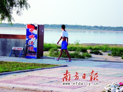 一個孩子走過“中俄邊境”的牌子,他對面是黑瞎子島。