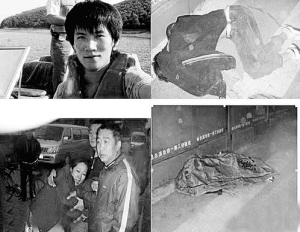 潘興聽到楊森喊,隨即看到林松嶺赤著上身很快跑過去,后面幾人在追。潘興回憶,當(dāng)天林松嶺穿著一件黑色的小風(fēng)衣,“外套是他自己脫掉的,但襯衫怎么沒有了我不知道。”潘興追出去幾十米后,看到林躺在地上,身體蜷曲著。“我扒開正在打松嶺的人說別打了,后面就有人抓住我的頭發(fā)把我摁住,不知道有幾個(gè)人照著我的頭不停地踢。”
