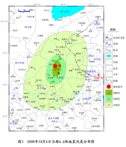 2008年10月6日16時30分(北京時間),西藏自治區拉薩市當雄縣(北緯29.8°,東經90.4°)發生Ms6.6級地震。地震發生后,由中國地震局、西藏自治區地震局和云南省地震局及西藏自治區相關單位組成的聯合地震現場工作隊在震區開展了為期7天的地震災害調查和損失評估工作,共計行程20000多公里,完成60個居民點和3個地震地質災害點的調查工作,其中抽樣調查點41個。在震區各級黨委、政府的協同配合下完成了地震災害損失評估工作。