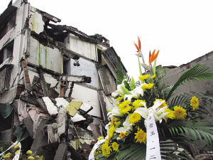 花籃上寫有“沉痛悼念”的字樣,它讓記者一下子想起,再過一天便是汶川大地震半年祭的日子。很多人都惦記著這個日子,不是有這么一句話么:人類之所以文明,人性之所以偉大,便是因為我們一直固執地選擇向逝者致哀。