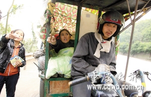 三輪車隊不得不重返210國道。四輛三輪車上,包括司機,共搭載了11人。一輛車便是一個家庭單元:夫妻或者父母兒女。一行人上月18日從廣東出發,一路經廣西、貴州,到昨日,已奔波了14天。