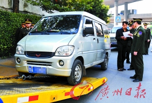 執(zhí)法人員昨日對一輛查獲的非法營運車輛依法進(jìn)行處理。 記者王燕攝