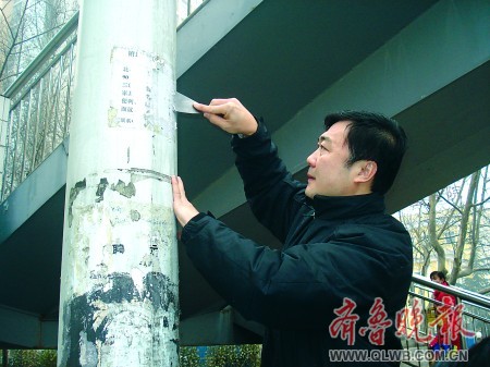 上午9時(shí),在兒童醫(yī)院東側(cè)路段,槐蔭區(qū)區(qū)長(zhǎng)楊峰,手里拿著一個(gè)噴壺和一把小鏟子,清理野廣告。看到一家電信營(yíng)業(yè)廳前的電線桿上貼滿野廣告,他過(guò)去先是用噴壺噴水,把紙弄濕,然后再用小鏟子快速鏟除。由于桿子上端也有臟兮兮的廣告,他踩上旁邊的一個(gè)鐵柵欄,伸長(zhǎng)手臂,費(fèi)力鏟凈。不多會(huì),桿子上的野廣告就消失殆盡,接下來(lái),他又用抹布把桿子擦干凈。