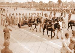 他說,當時炮兵方隊是第四個通過天安門廣場的隊伍,以輕迫擊炮、重迫擊炮、戰防炮、山炮和野炮、榴彈炮、高射炮等7種上百門火炮陣容出現。火炮由小到大,由低到高,依次前進,有的火炮是用騾馬拽著通過天安門的。