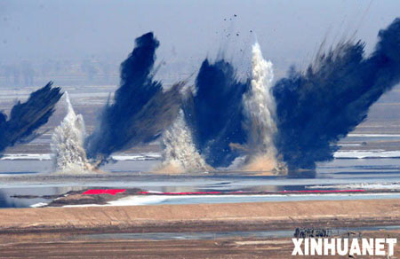 記者看到,這個河段的主河道還被厚冰覆蓋著,大堤外已經鋪起一個大大的紅色T字形參照物,這是為飛機投彈指示方位的。11時25分左右,3架銀色轟炸機穿過云層,飛抵黃河上空,進入投彈區域。