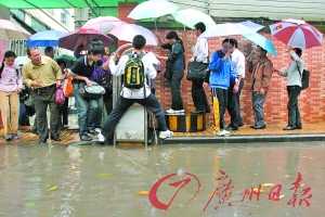 見聞:路兩邊的水很深,至少有1米寬的路面都浸在10厘米深的水里。站在華景路口的行人天橋上,中山大道從東往西方向全是一動(dòng)不動(dòng)的大車小車,從西往東則一輛也沒有。心里涼了半截,車肯定都堵在崗頂“大水坑”了。