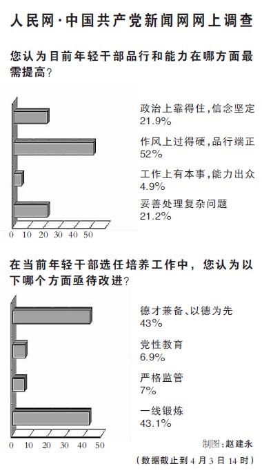 截至4月3日,人民網·中國共產黨新聞網推出的一項針對年輕干部的網上調查顯示:93.6%(1853票)的網友認為“目前大多數年輕干部工作經歷偏單一”; 43.1%(1095票)的網友認為應“樹立注重基層導向,堅持多崗位、在基層一線的實踐中培訓鍛煉年輕干部”。