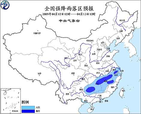 中新網4月12日電 據中國天氣網消息,中央氣象臺2009年4月12日10時發布暴雨預報: