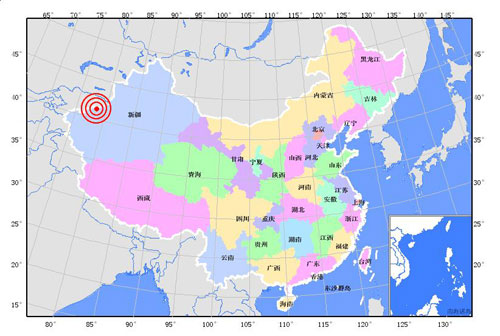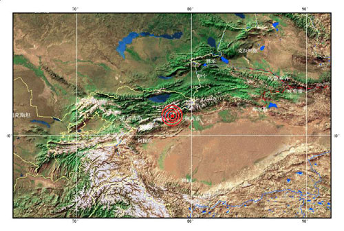 據(jù)測(cè)定,地震震中位于北緯四十一點(diǎn)三度, 東經(jīng)七十八點(diǎn)三度。